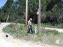 P5030032-RickTelephoneLine.JPG Rick installing a junction box between two of the cables by nailing the box to a tree; the phone worked the first time, but we had to come back and repair a broken wire after rolling the cable to the west (right). 2004:05:03 09:27:58 |